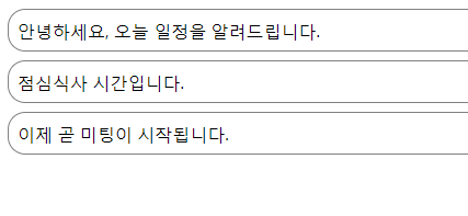 { id: 1, message: "안녕하세요, 오늘 일정을 알려드립니다." },